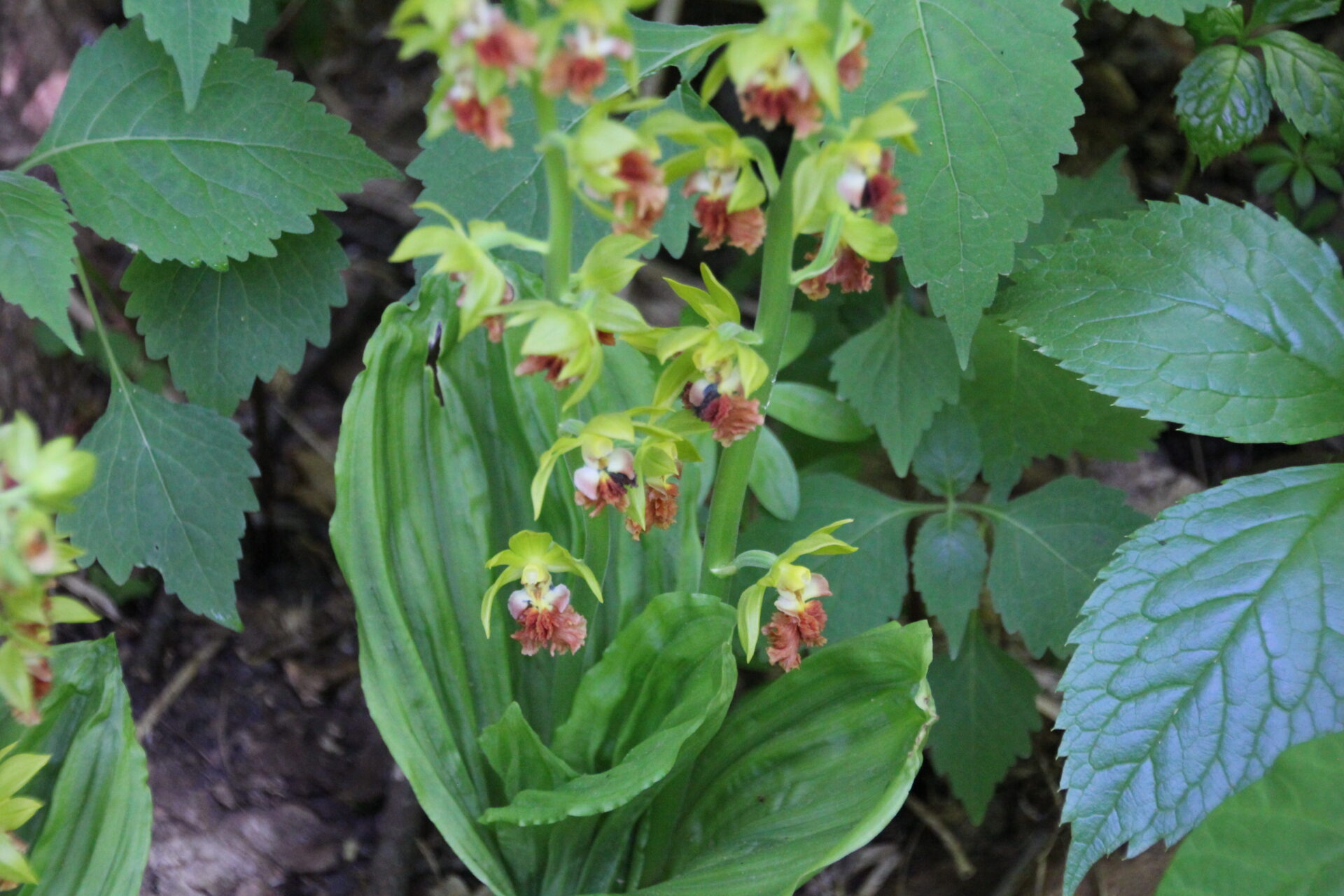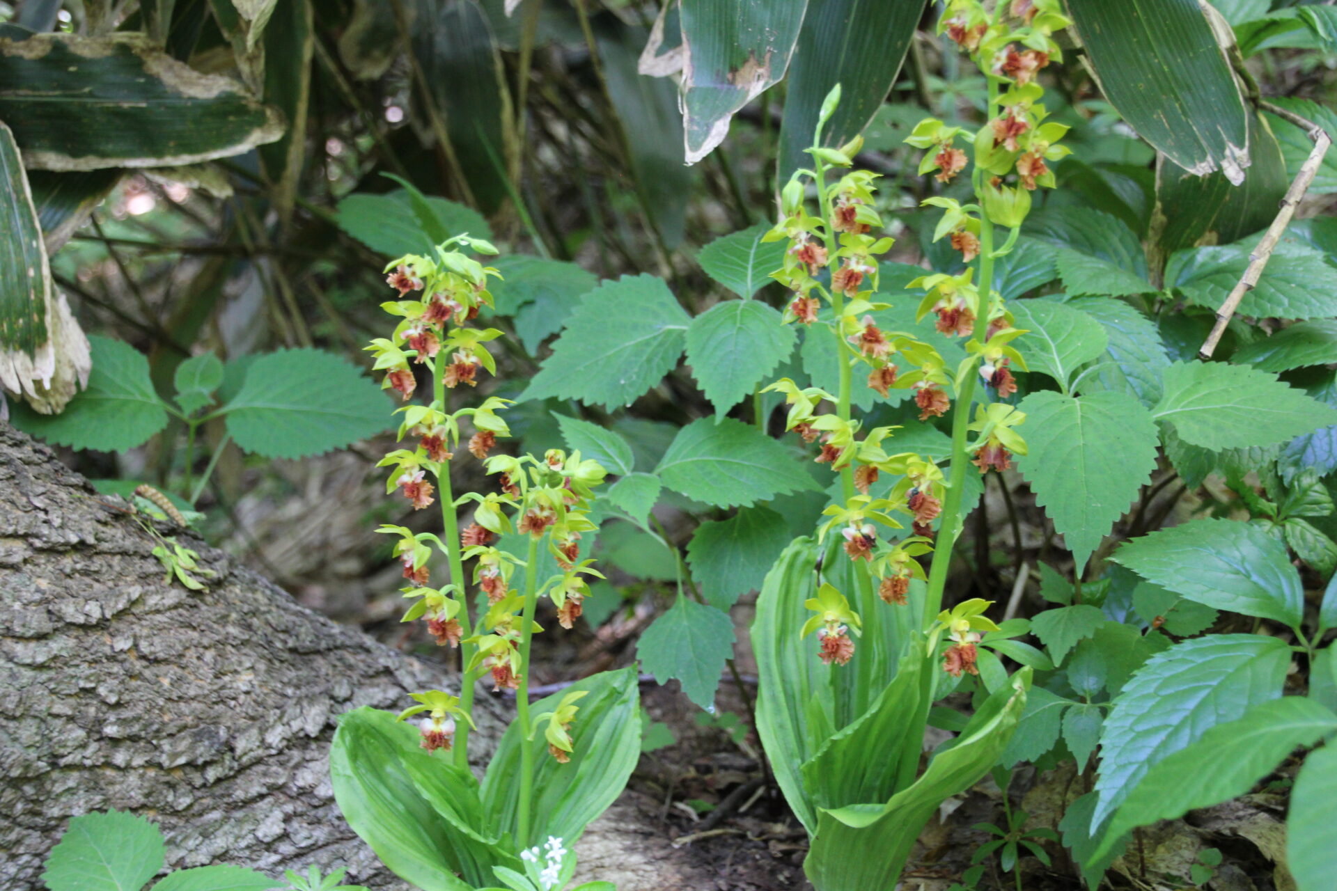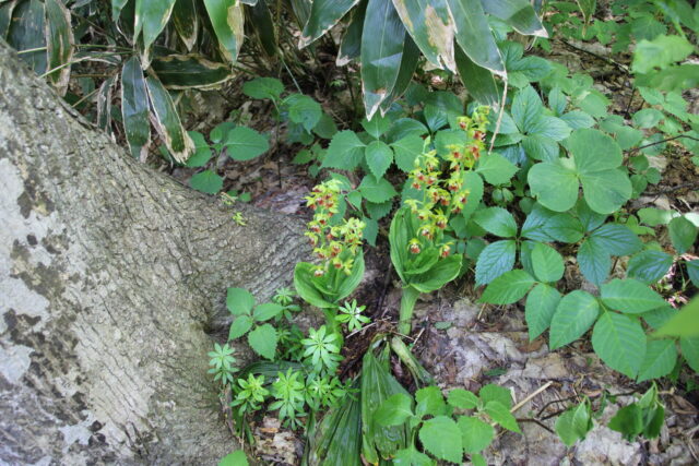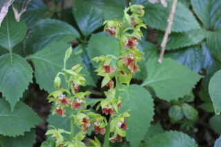 高さは40cmほどです。偽球茎がエビの形に似ているというエビネの仲間で、赤みを帯びた唇弁にシワが寄っていて猿の顔みたいだから、サルメンエビネ(猿面海老根)だそうです。